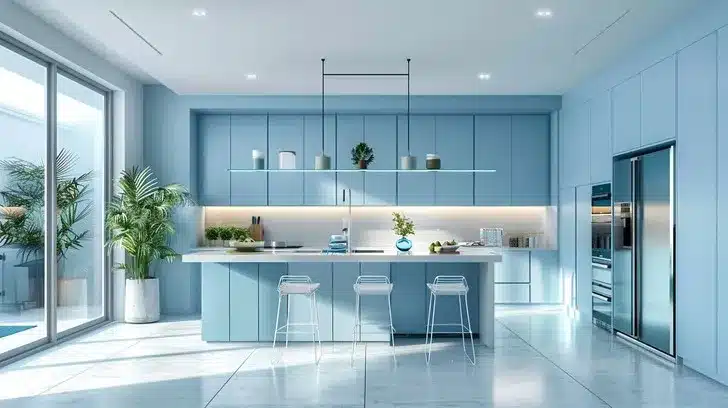 Qual é a melhor cor para criar uma cozinha mais relaxante? Tons frios, como azul e verde, proporcionando um ambiente calmo e relaxante, ideal para cozinhas tranquilas e aconchegantes.