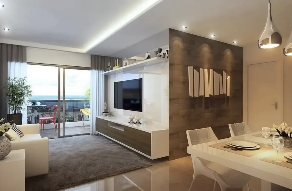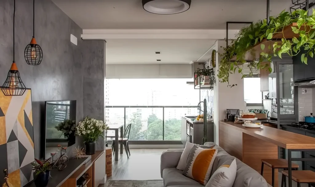 Ambientes integrados, como sala de estar e cozinha, ou sala e varanda, são uma tendência moderna que aumenta a sensação de espaço e traz mais luminosidade.