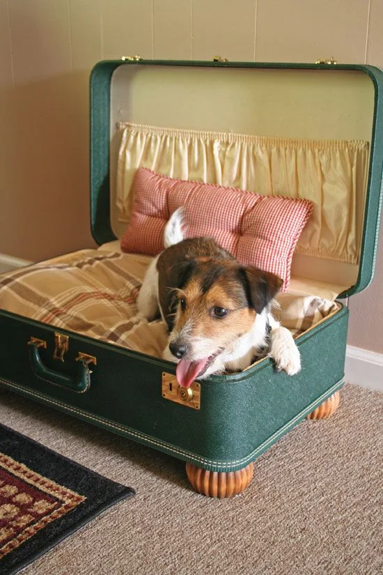 Transforme uma mala velha em uma cama aconchegante para seu amigo peludo.