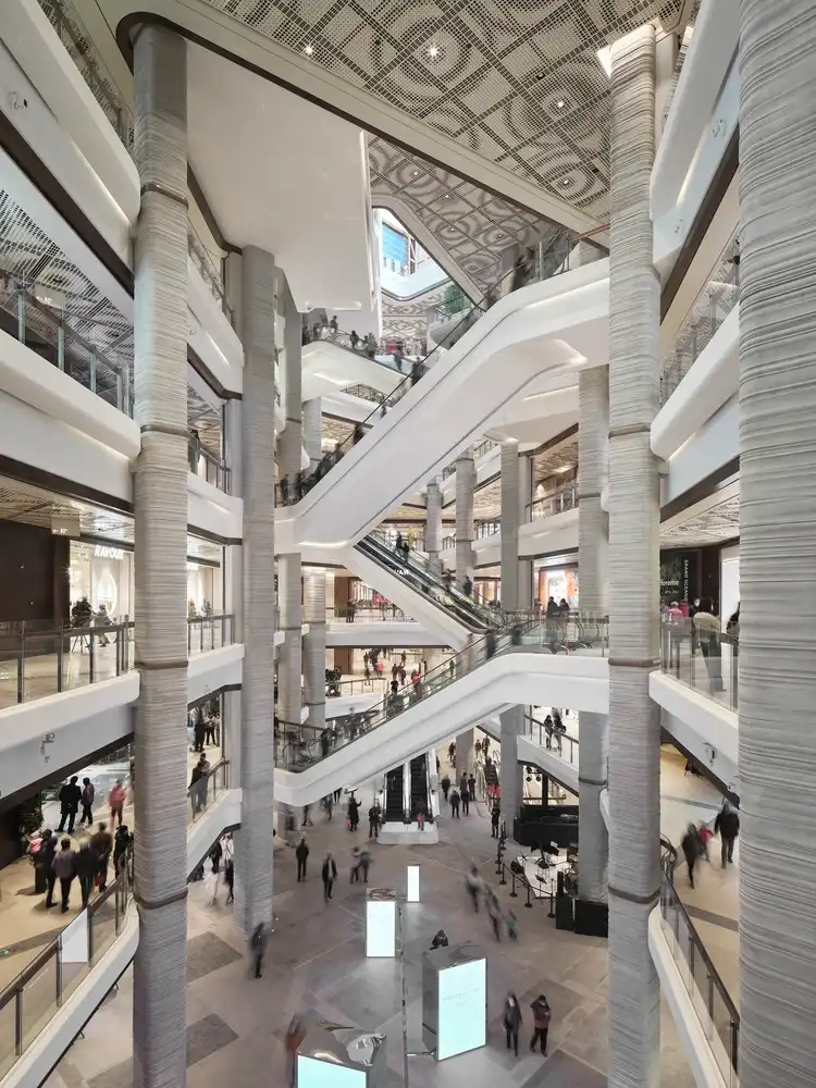 Os edifícios foram projetados com terraços recuados, proporcionando áreas externas privativas e vistas panorâmicas, uma característica rara em shoppings.