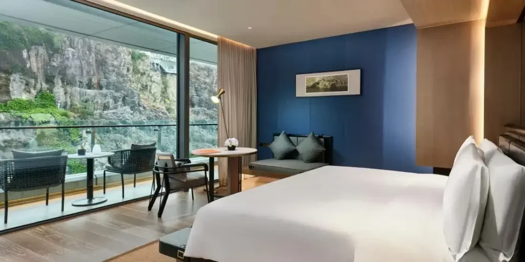 Com um total de 337 quartos e suítes, o hotel oferece varandas curvas que permitem aos hóspedes apreciar vistas das cachoeiras que descem das falésias ao redor e da impressionante cachoeira de vidro transparente situada no coração do edifício.