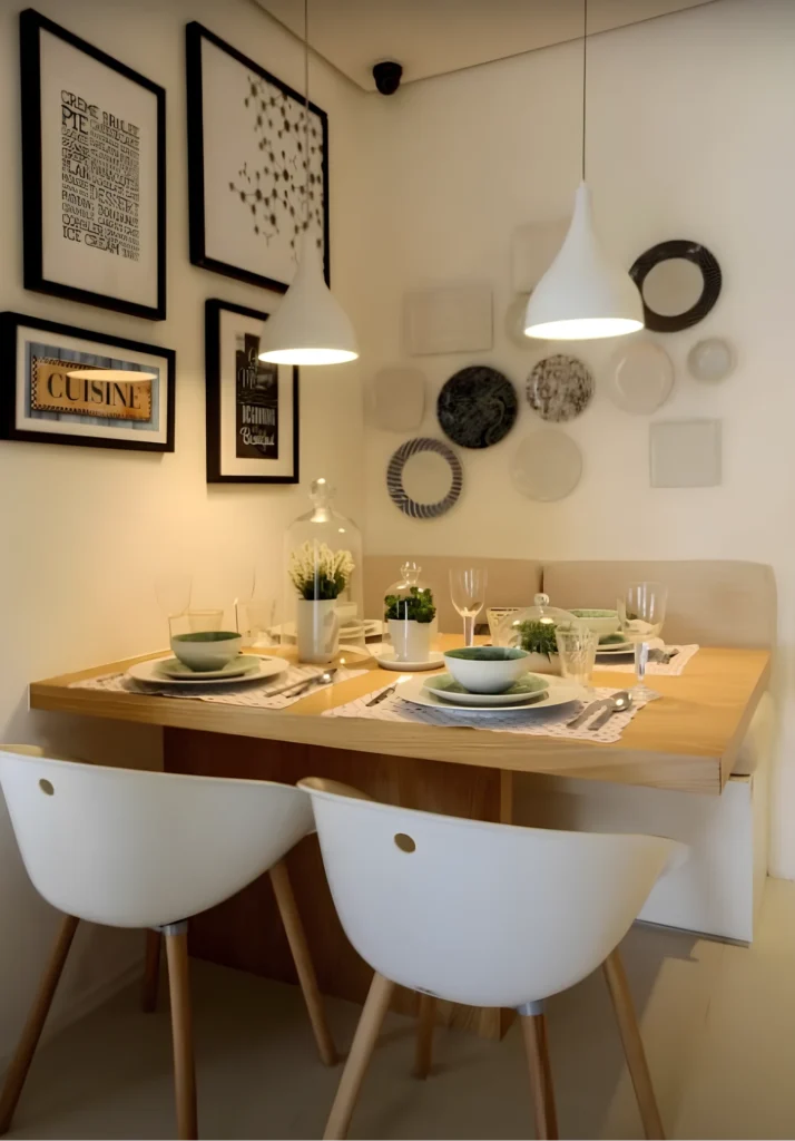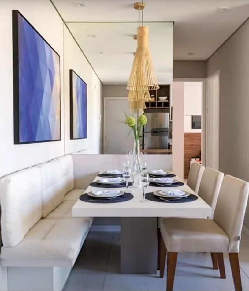 Esta configuração não só economiza espaço, mas também promove uma atmosfera íntima e relaxante, ideal para refeições em família e momentos sociais.