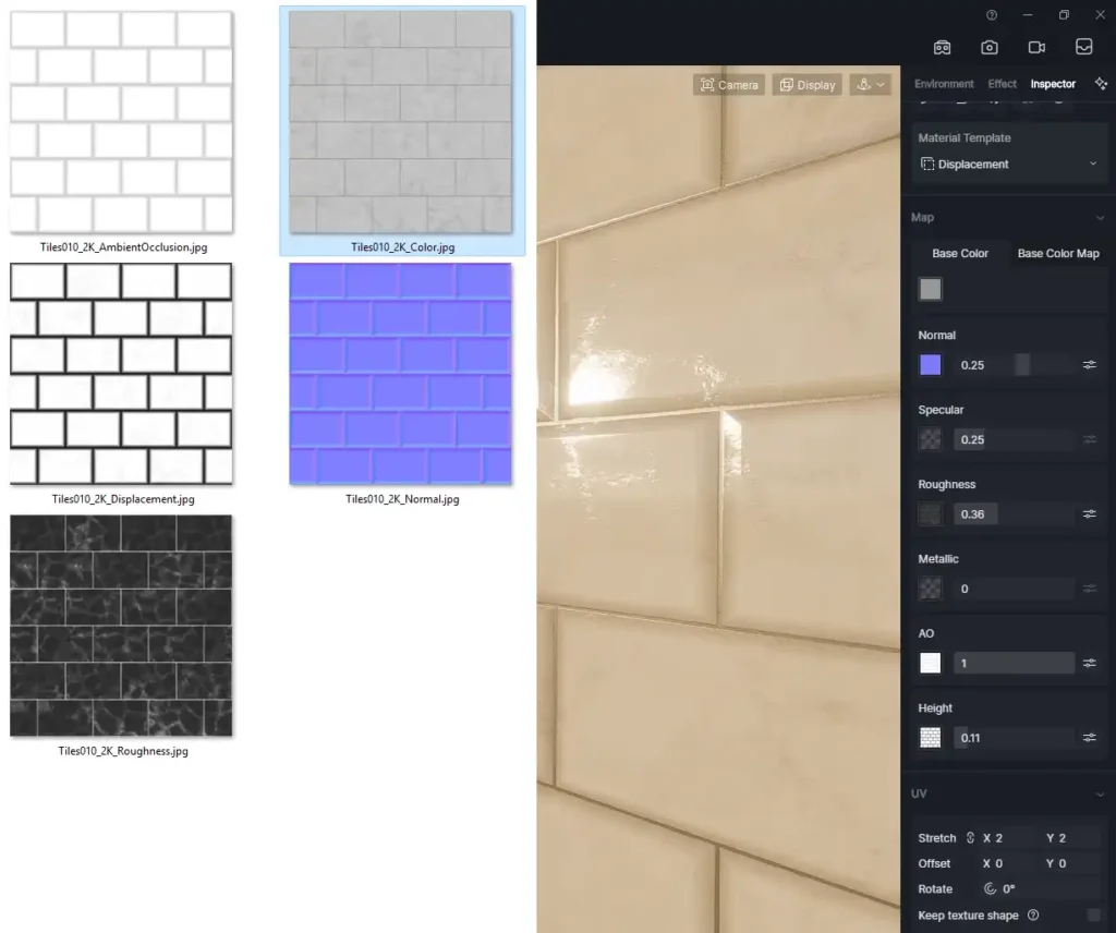 - Displacement (Mapa de Deslocamento): É uma textura que representa variações de altura na superfície, deslocando os vértices da geometria do objeto para cima ou para baixo com base nas informações contidas na textura. Aqui tons mais claros produzirão um deslocamento mais pronunciado, criando detalhes de relevo mais proeminentes, enquanto tons mais escuros resultarão em um deslocamento mais sutil. Usado para criar superfícies orgânicas, terrenos complexos ou objetos com texturas intricadas.