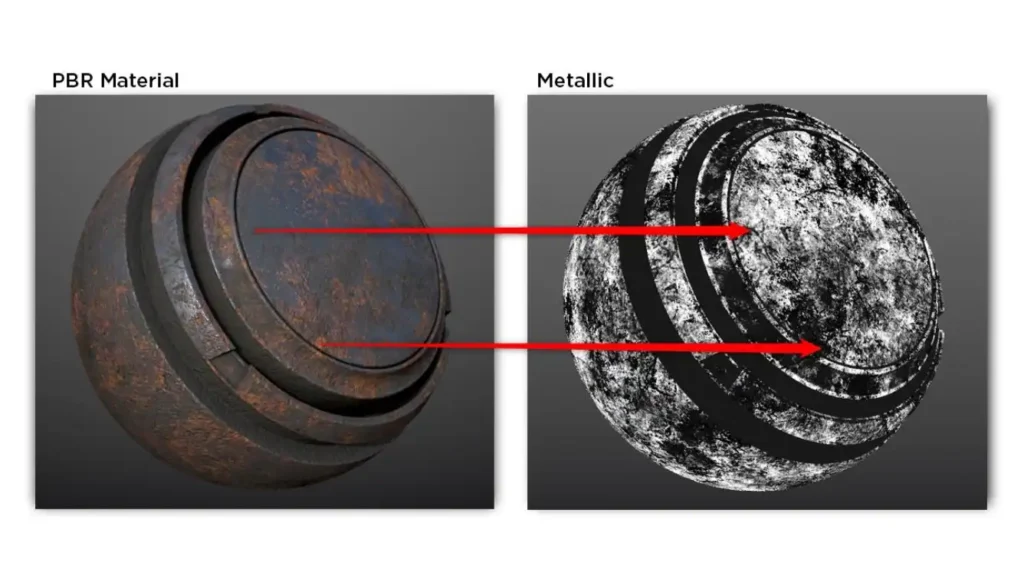 Em termos técnicos, o mapa de Metalness é uma textura que define a metalicidade de um material em cada ponto da superfície do objeto.