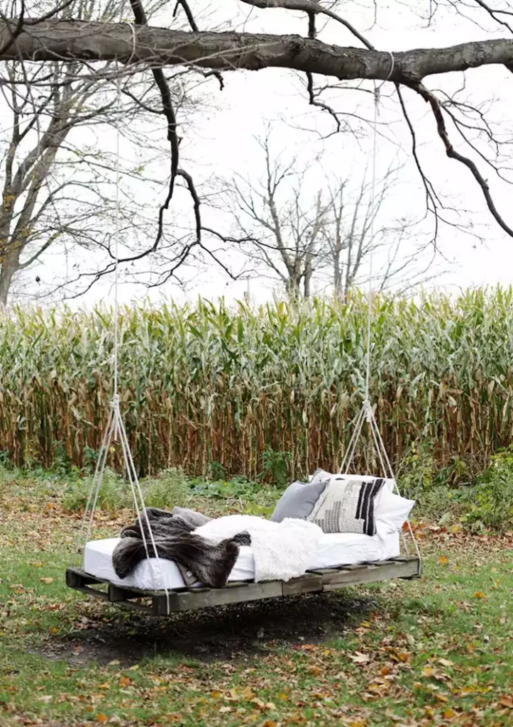 Se você possui um colchão de casal e alguns paletes antigos à disposição, por que não colocá-los em uso construindo você mesmo uma rede de balanço.