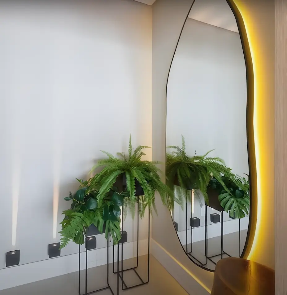 • Cantinhos Decorativos: Um espelho orgânico de corpo inteiro em um cantinho com plantas e luzes LED cria um ambiente aconchegante e funcional, perfeito para tirar fotos de looks.