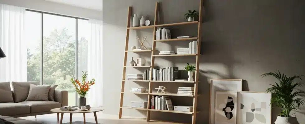 As estantes em formato de escada possuem um design moderno e sofisticado.