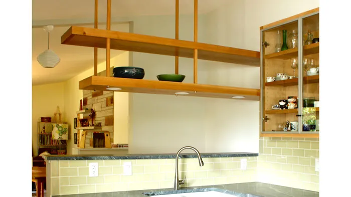 Um dos segredos para decorar uma kitnet é utilizar bem os espaços utilizando prateleira penduradas no teto.