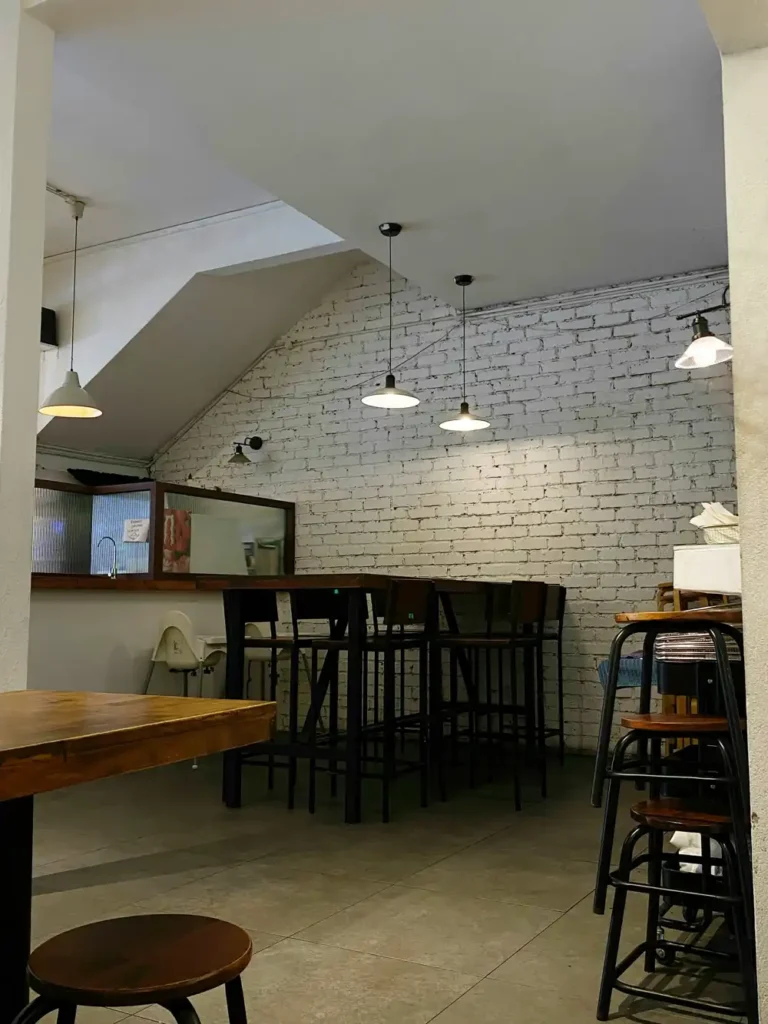 Ele tem pé-direito alto e elementos como vigas de madeira e tijolos à vista.