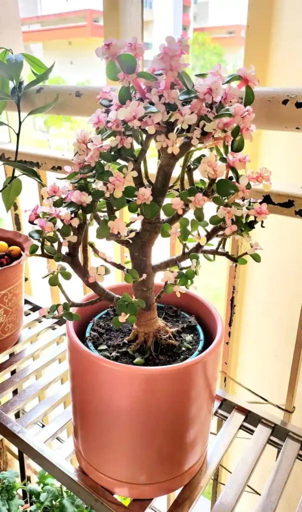 Vasos decorativos planta de Jade com flor rosa