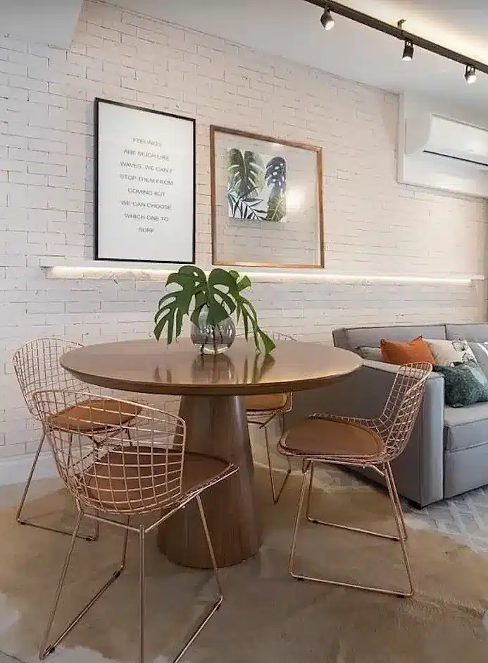 - Mesas redondas são uma ótima opção para espaços pequenos, pois ocupam menos espaço e permitem uma melhor circulação. Mesas retangulares também podem funcionar bem, especialmente se encostadas em uma parede para otimizar o espaço.