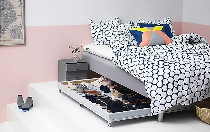 Uma opção prática para economizar espaço é usar um organizador de calçados feito de plástico, nylon ou tecido que pode ser pendurado na barra da cama e escondido pelo lençol.