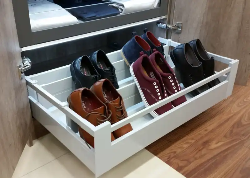 Para calçados menores ou mais delicados, gavetas com divisórias ajudam a mantê-los organizados e protegidos de danos.